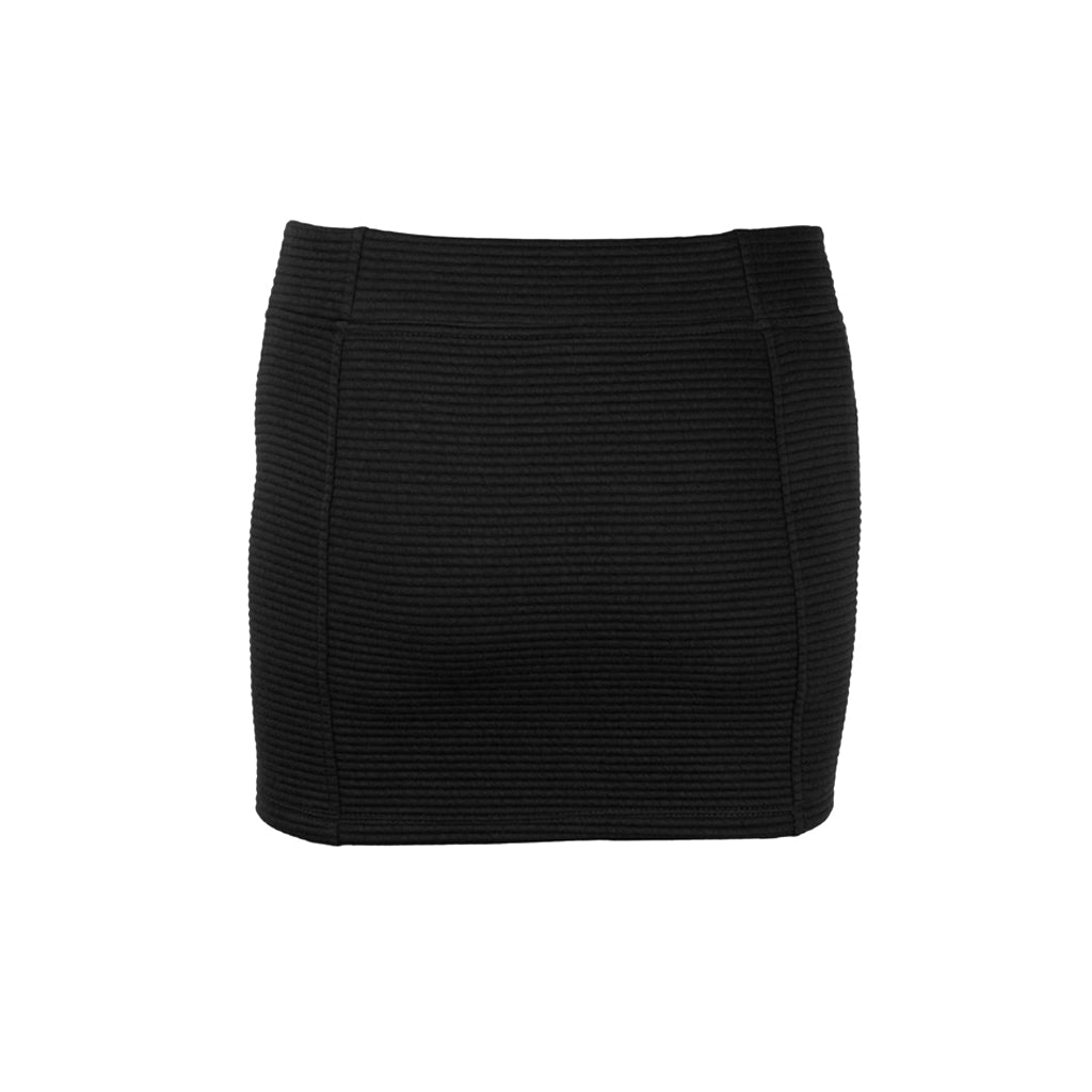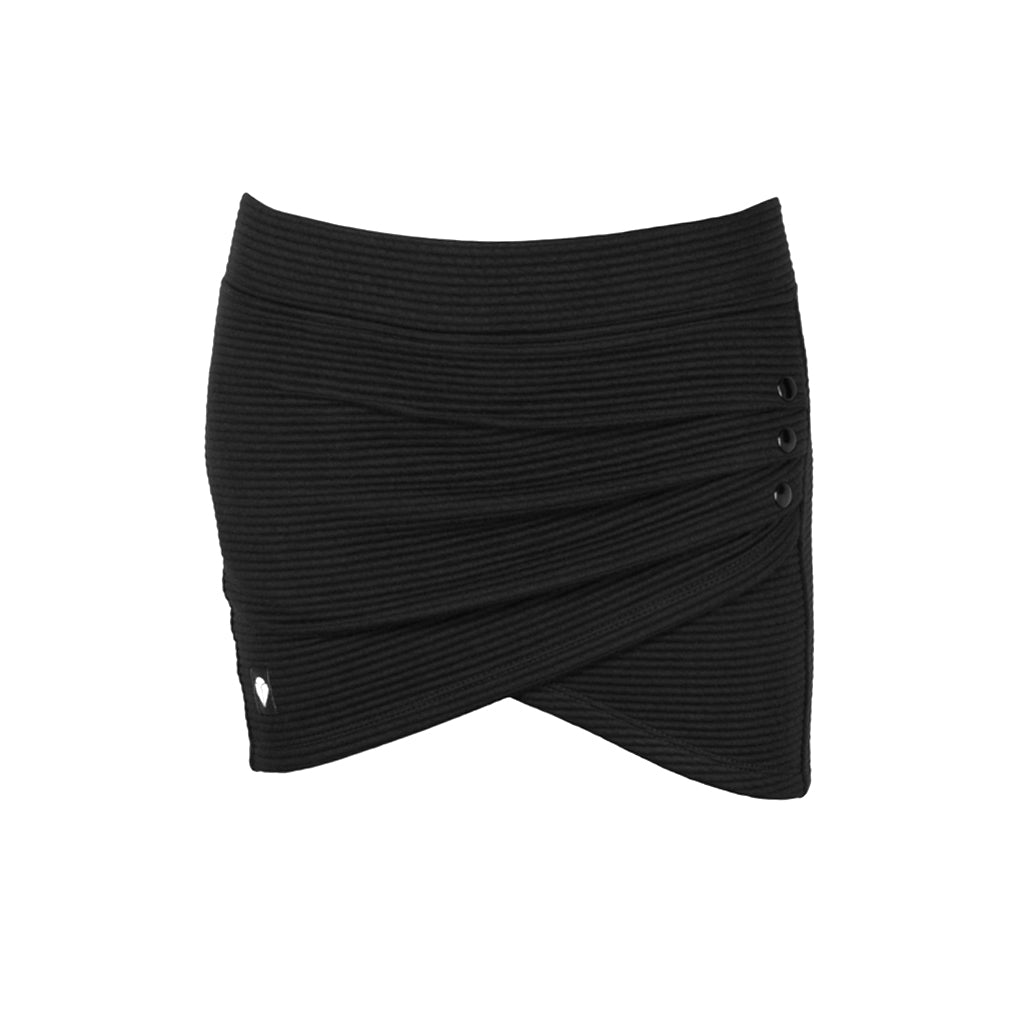 · Falda asimétrica corta de cadera. Tejido elástico y cinturilla con goma. Detalle de remache metálico en color negro.